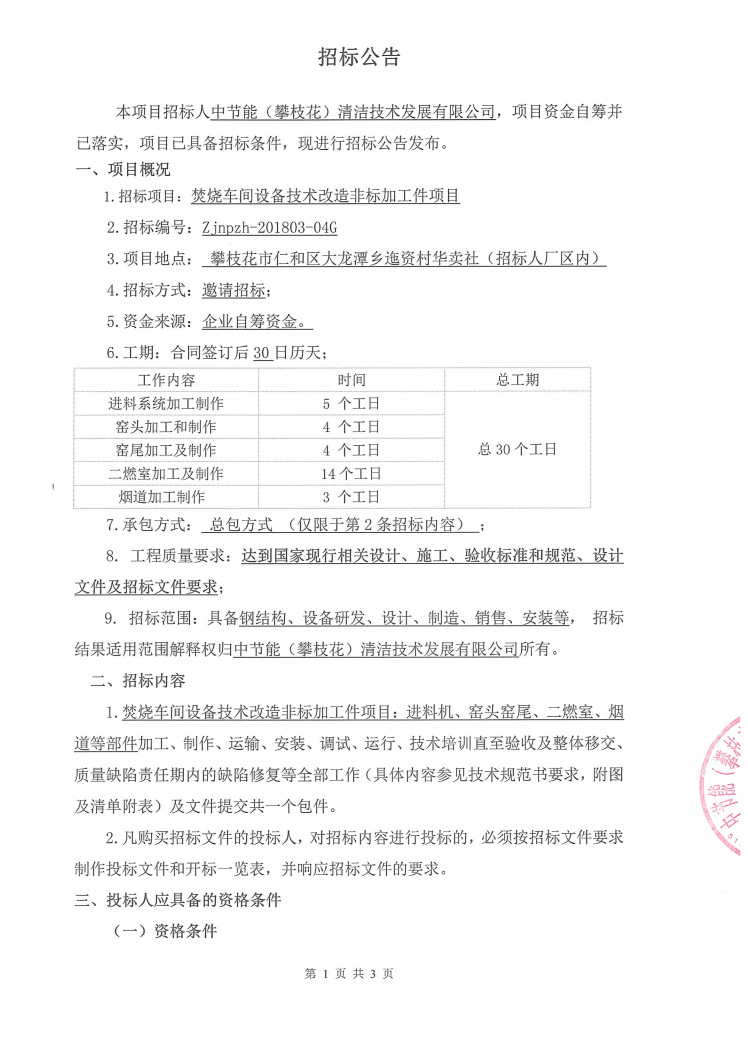 焚燒車間設備技術改造非標加工件項目招標公示