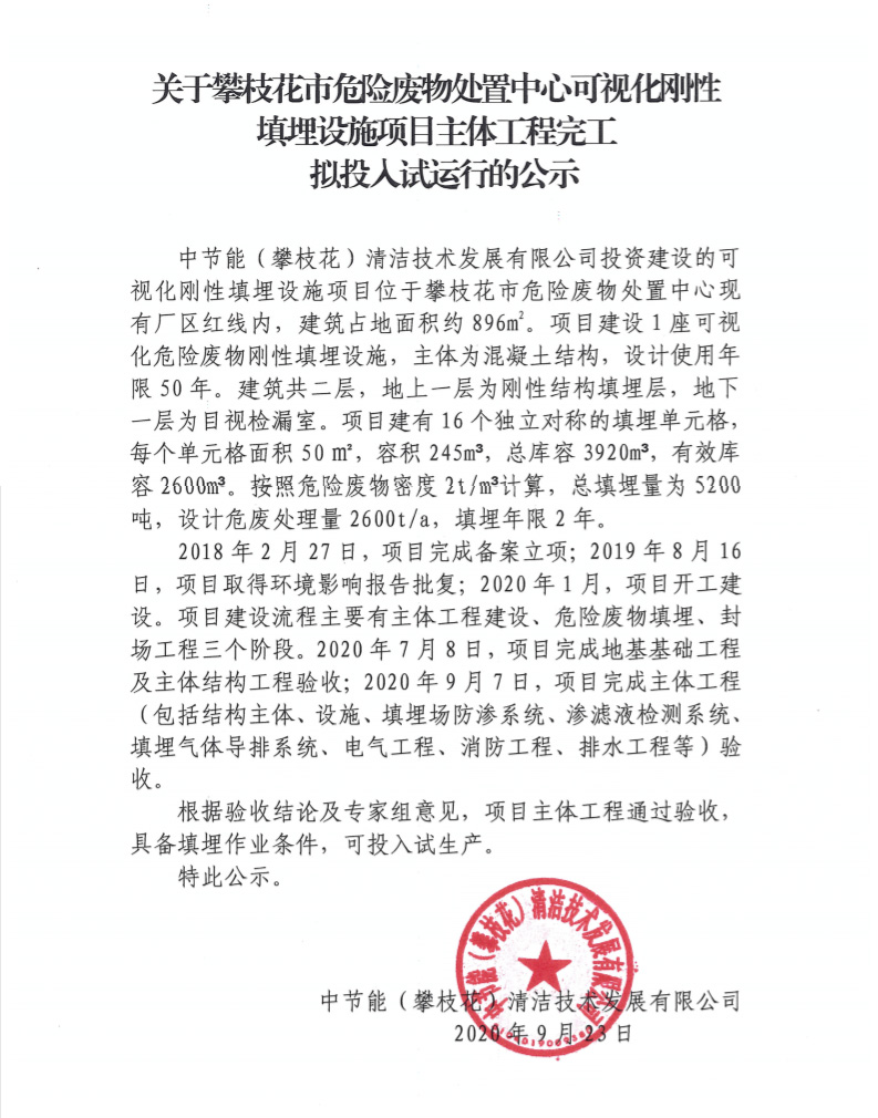 關(guān)于攀枝花市危險廢物處置中心可視化剛性填埋設(shè)施項目主體工程完工擬投入試運行的公示