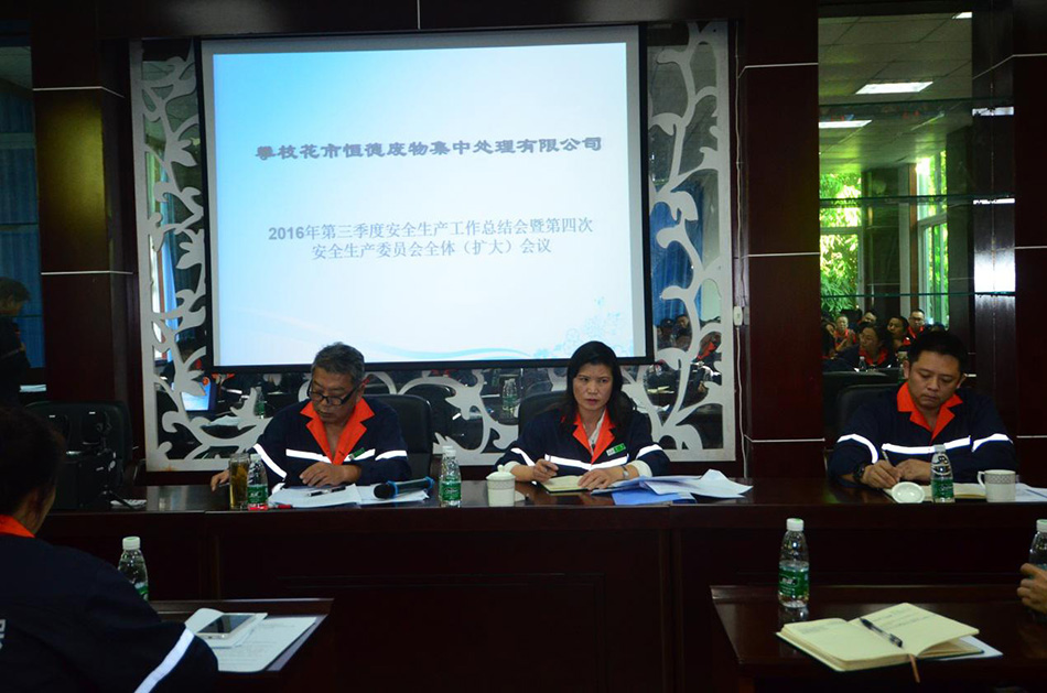 2016年11月10日下午,攀枝花市恒德廢物集中處理有限公司召開(kāi)了第三季度安全生產(chǎn)工作總結(jié)會(huì)暨第四次安委會(huì)(擴(kuò)大)會(huì)議,公司安委會(huì)成員和全體員工參加會(huì)議。 會(huì)議學(xué)習(xí)了中環(huán)集團(tuán)公司鄭朝輝董事長(zhǎng)關(guān)于“中國(guó)環(huán)保