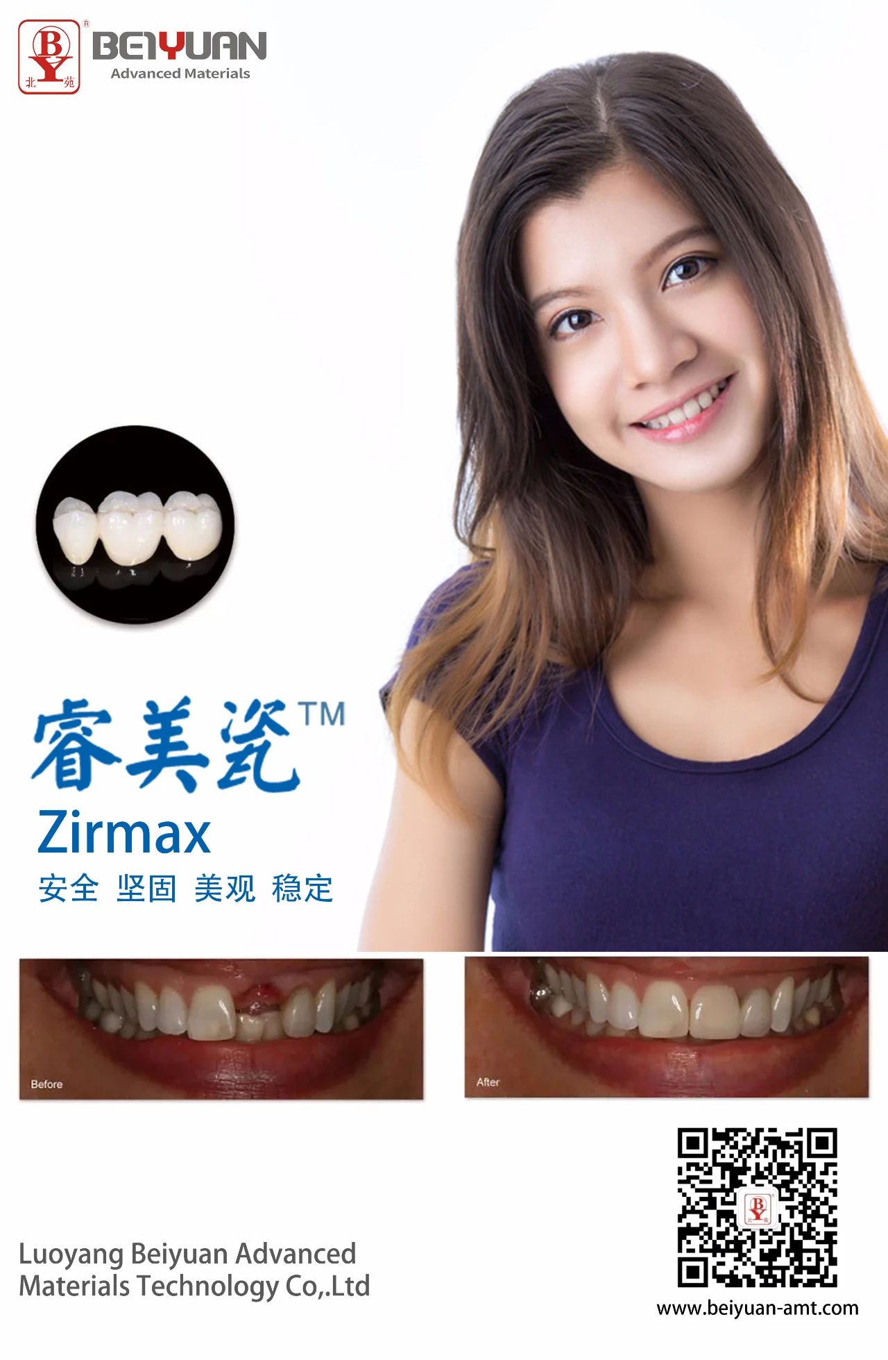 北苑睿美瓷氧化鋯是由北苑新材料技術(shù)有限公司憑借多年的牙科材料生產(chǎn)經(jīng)驗自主研發(fā),是覆蓋全部牙冠表面,且不含金屬內冠的瓷修復體。由于內冠不再使用金屬,而采用與牙齒顏色相近的高強度瓷材料制成,因此較金屬基底烤瓷修復體更美觀(guān),半透明度與天然牙近似,修復后牙齦邊緣表現更加自然,可達到仿真效果,且具有對周邊組織無(wú)刺激等優(yōu)點(diǎn),已被廣泛用于臨床,尤其在前牙美學(xué)修復時(shí)常被選用。